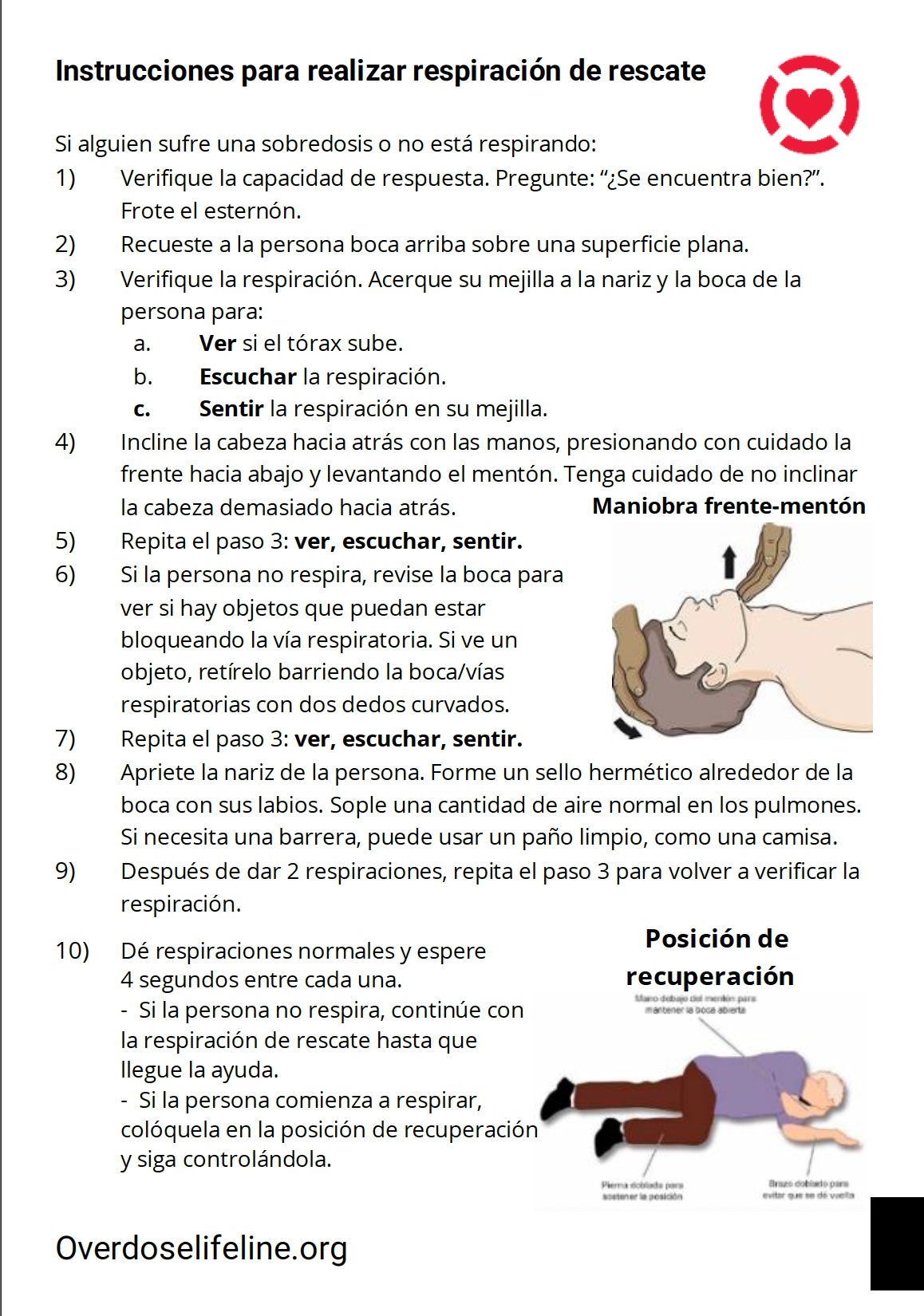 Instrucciones para realizar respiración de rescate y posición de recuperación
